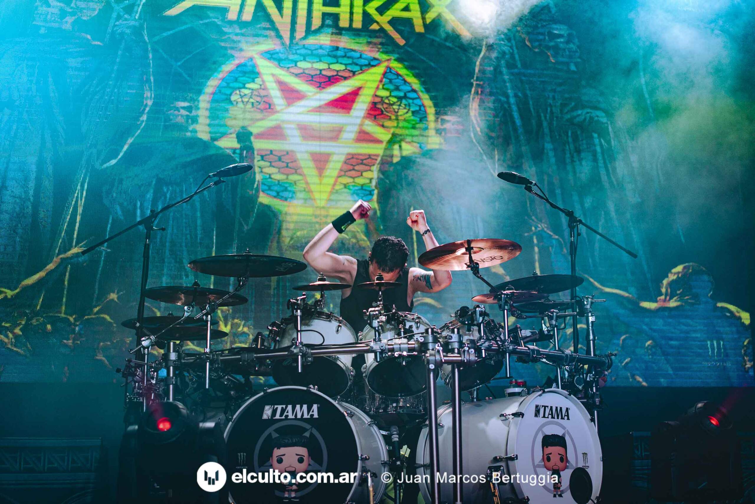 La buena interacción entre la enérgica banda sobre el escenario y el descontrol de rondas, pogo y cantos entre los asistentes se manifiesta en “Madhouse”. “¿Les gusta el thrash metal?”, preguntó Scott Ian en español ante la contundente respuesta del público, cuernos en alto mediante, para arremeter con “Metal Thrashing Mad”, único representante en la lista de “Fistful of Metal”, el álbum debut de la banda. “Tenemos a nuestra familia aquí”, fueron las palabras de Joey Belladonna para presentar “Keep it in the Family”, con una intervención final a cargo de Charlie Benante que fue muy festejada.