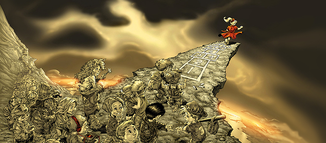La imagen retrata a una niña jugando a la rayuela cerca del borde de un acantilado, con otros niños esperando seguir su camino. Contrariamente a la apariencia, el título del álbum no hace referencia al juego infantil, sino que surge como una provocación de Fieldy hacia otras bandas influenciadas por Korn. Según Jonathan Davis, en ese momento Fieldy era “arrogante”, y la elección del título era una especie de indirecta: “Sí, vamos, tontos, sigan al líder”. Ironías del destino, el álbum se convirtió en uno de los más exitosos de la banda.