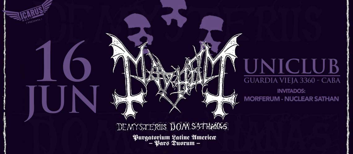 Mayhem es una banda noruega de black metal fundada en 1984 por el bajista Jørn “Necrobutcher” Stubberud, el baterista Kjetil Manheim y el guitarrista Østein “Euronymous” Aarseth.1 La banda sufrió varios cambios en su formación debido a la muerte y encarcelamiento de algunos de sus miembros. En 1991 el vocalista Dead se suicidó y en 1993, el guitarrista Euronymous fue asesinado por Varg Vikernes, lo que provocó la disolución de la banda. Durante este tiempo fue publicado su álbum debut, “De Mysteriis Dom Sathanas” (1994).