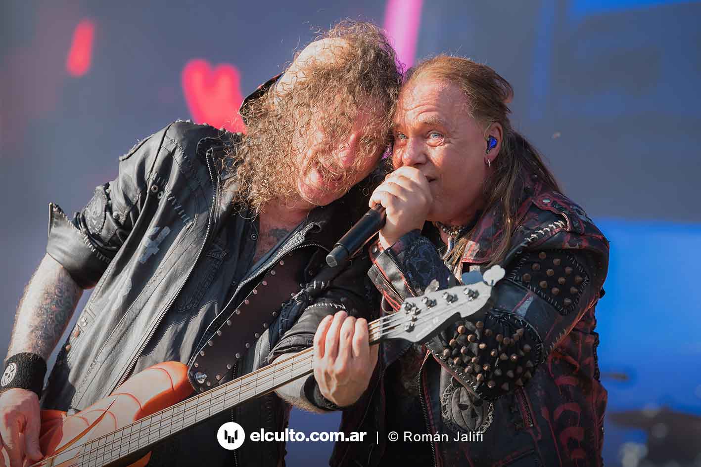 Luego del primer acto internacional, llegaba el turno de Helloween. La legendaria banda alemana saldría a las tablas con el potente tándem de “Dr. Stein”/”Eagle Fly Free”, demostrando el gran acierto de su renovada versión de siete integrantes. Andi Deris, quien comparte la voz principal junto a Michael Kiske, hizo gala de su muy buen español para felicitar a la audiencia por el título mundial de la selección argentina, ganándose a todos de inmediato, y ofició de interlocutor durante toda la presentación, aprovechando su conocimiento del idioma. Los mencionados cantantes se reparten las estrofas con sapiencia, otorgándose momentos de lucimiento entre ambos y potenciando las canciones, como en el gran dueto vocal durante la balada “Forever and One”. Kai Hansen, guitarrista y fundador de la banda, tiene su momento personal durante “Heavy Metal (Is the Law)”, que lo encuentra además haciéndose cargo del micrófono, como en la era inicial de Helloween. Sus colegas de instrumento, Michael Weikath y Sascha Gertsner, se reparten el protagonismo, ofreciendo este último un solo antes de “Best Time”, tema del último álbum de la banda. Un solo de batería perfectamente ejecutado por Dani Löble hizo de intro para “Future World”, una de las más festejadas del concierto, antes de que llegara el gran cierre con “I Want Out”, el tema icónico de Helloween para la culminación de sus shows, con calabazas gigantes flotando sobre los espectadores, mientras el poder del power metal sobre el escenario ofrecía su último acto.
