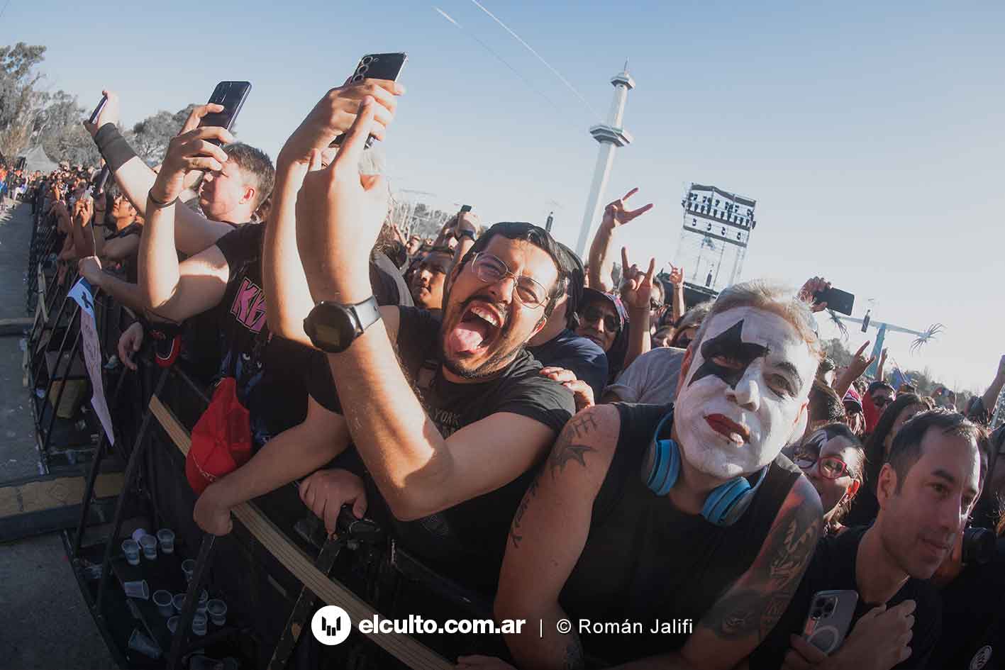 “Shout It Out Loud”, “Lick It Up” y “Pshyco Circus” son algunas de las canciones más celebradas por una audiencia totalmente pasional hacia la banda. A la hora de hacer el ranking de las bandas más queridas en el país, Kiss de seguro se encuentra entre las principales, y eso lo muestran las distintas generaciones de fans presentes en el show y la devoción demostrada hacia los cuatro señores de rostro pintado. Claro que los recitales de Kiss son más que música, son un espectáculo en sí mismo, y así nos encontramos a Thayer impidiendo una invasión extraterrestre durante su solo de guitarra, o a Gene Simmons convirtiendo al recital en una película de terror clase B durante “God of Thunder”. Pero el ápice del show se lo lleva Paul Stanley flotando sobre el campo durante “Love Gun”, colgándose de un cable de acero para llegar a la tarima desde la que también cantaría el hit “I Was Made For Lovin’ You”. Los bises finales comenzarían con “Beth” (con Eric Singer cantando desde el piano), para luego seguir con “Do You Love Me” y terminar a pura fiesta con “Rock And Roll All Nite”. La gran celebración del rock pesado llegaba a su culminación, pero lo que nunca terminará es este estilo de música en sí, siempre y cuando nuevas camadas puedan continuar el legado de los maestros, quienes en el festival del viernes nuevamente dieron cátedra.