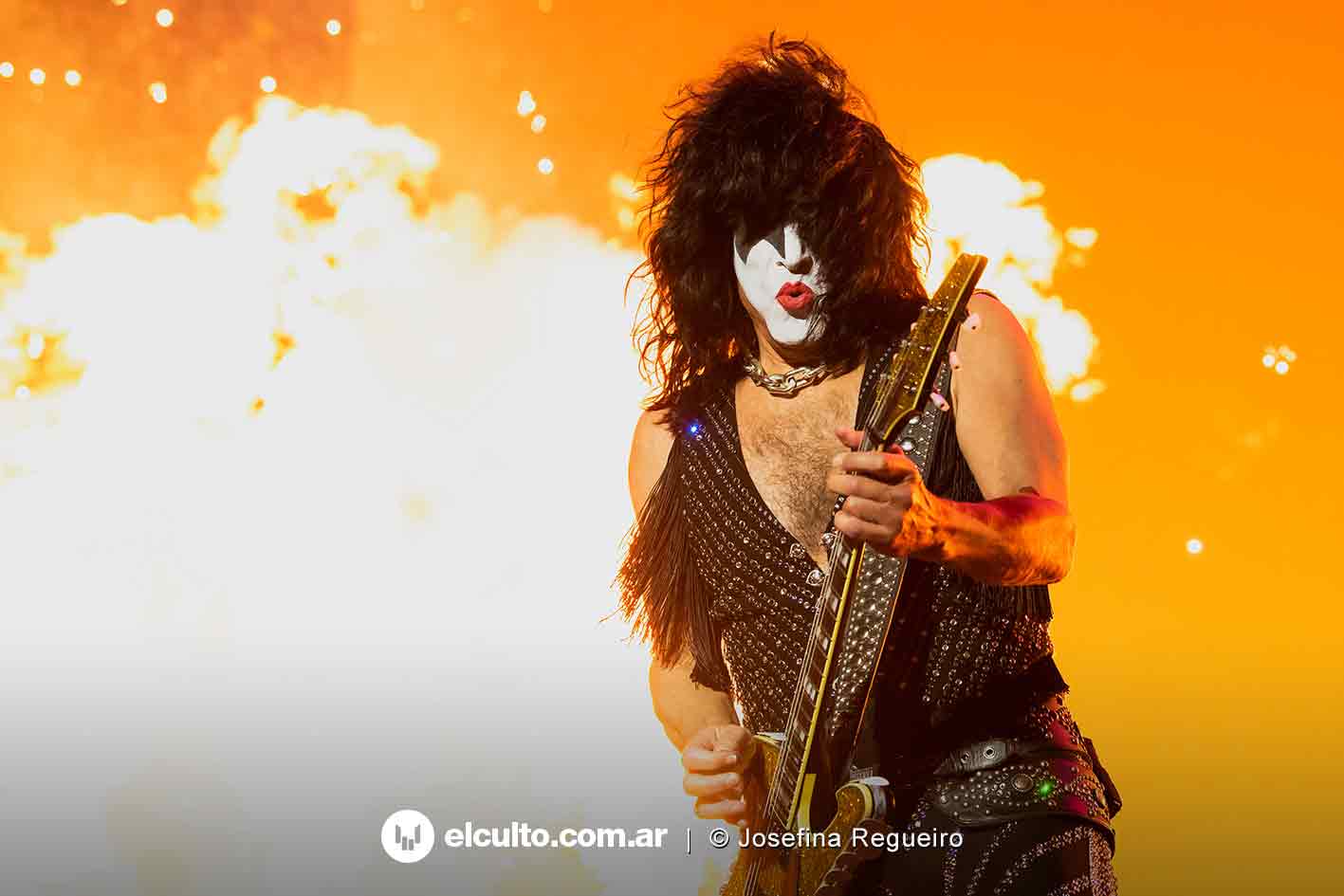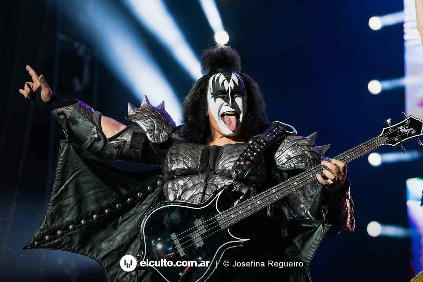 Finalmente, era hora del plato principal de la noche, la presentación de Kiss, por ¿última vez? en Argentina. Terminó de sonar “Rock And Roll” de Led Zeppelin (en la noche de los titanes del rock, urgía la presencia de Zep), las luces se apagaron y las pantallas comenzaron a mostrar las imágenes de la banda dejando los camarines y dirigiéndose al escenario. La voz del presentador anunció la salida del conjunto, y, telón mediante, comenzaron a sonar los poderosos fraseos iniciales de “Detroit Rock City”, con la banda bajando desde unas plataformas que los depositan en el escenario. La pirotecnia acompaña al tema, así como los coros de miles de almas se suman al solo de guitarra; la fiesta kissera estaba oficialmente inaugurada. Paul Stanley interactúa con el público constantemente, oficiando de buen frontman, y repitiendo el famoso “mi corazón es suyo”, presente desde las primeras visitas de la banda al país. Gene Simmons, por su parte, ofrece todo su repertorio garantizando el entretenimiento, con sus poses y la característica lengua de reptil ante cada enfoque de la cámara. Eric Singer, el baterista más longevo que tuvo la banda, aporta lo suyo tras los parches pero también es quién suma los registros agudos en los coros, aprovechando sus buenos dotes vocales, mientras que el guitarrista Tommy Thayer cumple sobradamente sus funciones de guitarra líder.
