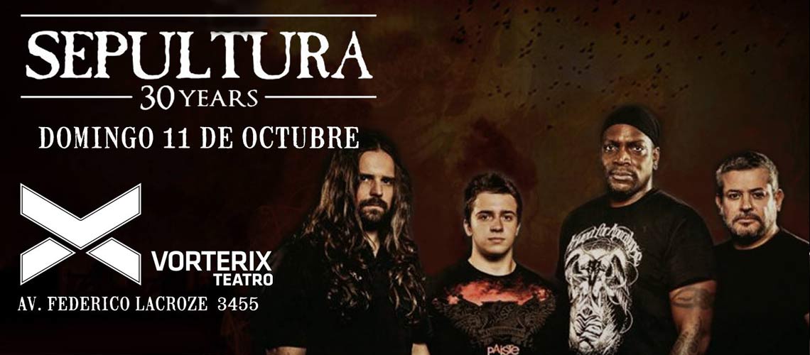 Sepultura cumple 30 años de carrera y lo celebra con una gira mundial que los traerá de regreso a Buenos Aires. El Domingo 11 de Octubre la leyenda del metal se presentara en el Teatro Vorterix, junto a Horcas como banda invitada. La banda está integrada actualmente por el bajista Paulo Jr., Andreas Kisser en guitarra, Derrick Green en voz y Eloy Casagrande en batería.