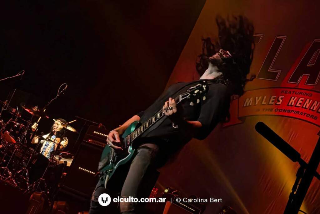 Sobre el cantante, además de su prodigiosa y cuidada voz, a la que es imposible encontrarle salidas de tono, también se destaca su carisma escénico. Sin estridencias y consciente de su lugar secundario, Myles saluda, arenga a los espectadores y agradece una y otra vez por la devoción mostrada desde las gradas, como en las baladas “Bent to Fly” y “Starlight”. Otro que se destaca es el bajista Todd Kerns, dueño de habilidades vocales que lo podrían ubicar como la voz principal de cualquier banda, y que lo ayudan a tomar el micrófono primario en temas de registros tan variados como “Always On The Run”, la colaboración de Slash con su amigo Lenny Kravitz, “Doctor Alibi”, cantado originalmente por el inmortal Lemmy Kilmister o “Don’t Damn Me”, el tema de Guns N’ Roses elegido por la banda para esta gira y que hizo entrar en ebullición al campo del Movistar Arena.